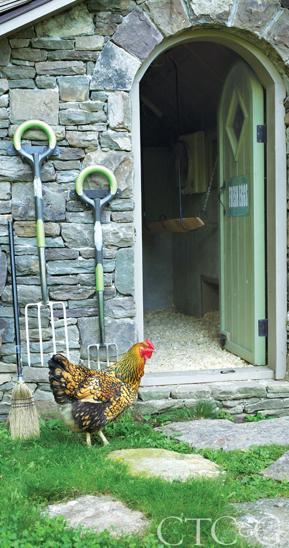 Determined to utilize as much local material as possible, John Conte repurposed fallen cedar and locust logs from around his and neighboring properties, along with boulders gathered from the Byram River intermixed with Pennsylvania fieldstone, to build the chicken coop.