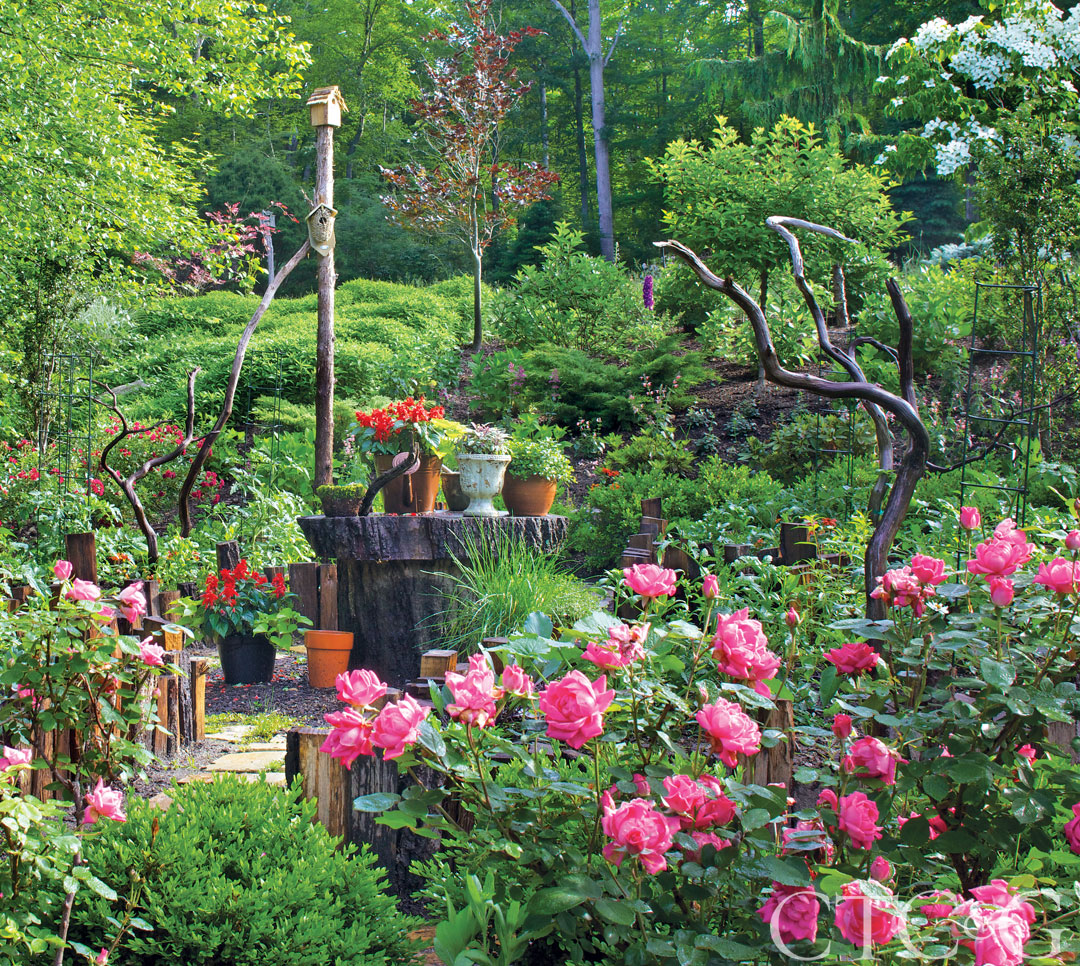 Brilliant Knock Out roses greet visitors in the cutting garden, which boasts with naturalistic birdhouses, a variety of potted arrangements and a tree-trunk table.