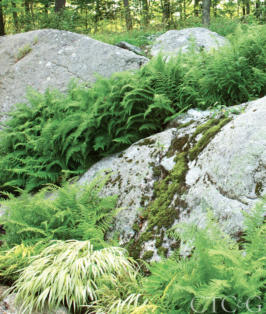 Japanese forest grass and lady fern engulf moss-covered boulders.