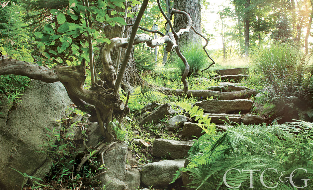 Beneath a canopy of trees, a mountain laurel’s branches act as a natural handrail along stone steps.