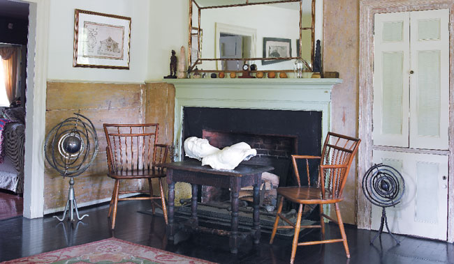 The Lears raised six children there, making full use of the four bedrooms and three baths, mostly in an 1850s addition that also contains the present kitchen and dining room. The house is furnished with antiques, many found in the attic and elsewhere in the house, and period-appropriate reproductions. “So much was here—wood chests, mirrors, china, fireplace implements . . . and a lot of junk, too,” says Lear. In the attic, the couple found Sherrill family photographs and correspondence; in a boarded-up fireplace, they uncovered a cache of hand-forged fishing hooks made from either ivory or bone. The ironstone displayed in the kitchen and the contents of a corner cupboard in one of the parlors—including 18th-century Sèvres porcelain and Limoges china—also came with the purchase.
