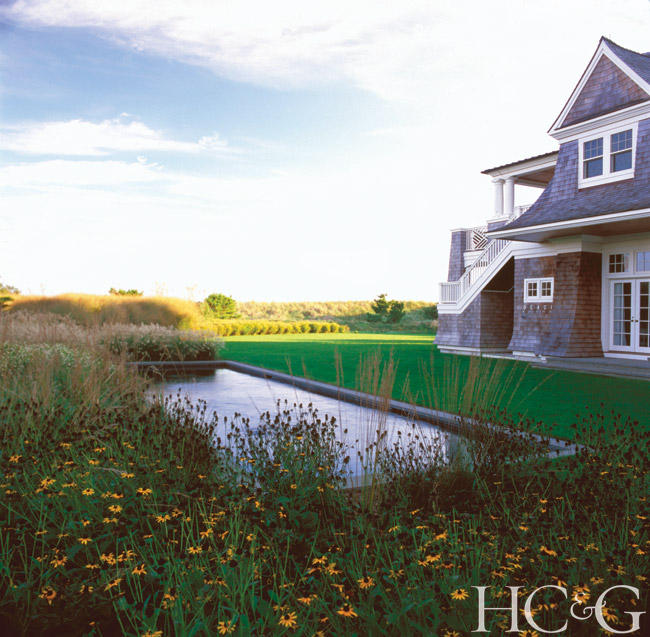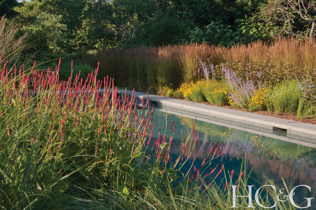 Rudbeckia, Panicum, and Calamagrostis edge a pool at a residence in the Georgica Association.