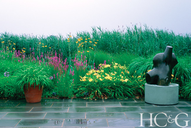 A tapestry of flowering perennials, including daylilies and liatris, creates a lush backdrop to a Henry Moore bronze