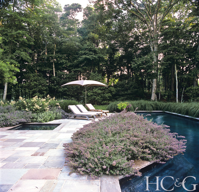 A pocket planting of Nepeta softens hardscaping by a swimming pool.