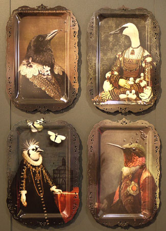 Totally oddball subjects, like portraits of human beings with bird heads, or rams dressed in dandy suits, is entirely normal subject matter at ibride, and really looks cool in the right setting. Advancing the art of decorating an object by glueing paper cutouts onto it in combination with special paint effects and gold leaf, ibride uses simple trays as a canvas and paints elaborate portraits of humans who have morphed into creatures, or what the French call faux-semblants (pretending to be something or someone else). Like a Vermeer portrait in which a rabbit’s head, in full ruff collar, replaces a woman’s head. Or the collection of birds dressed to kill in 18th-century ensembles as seen here.