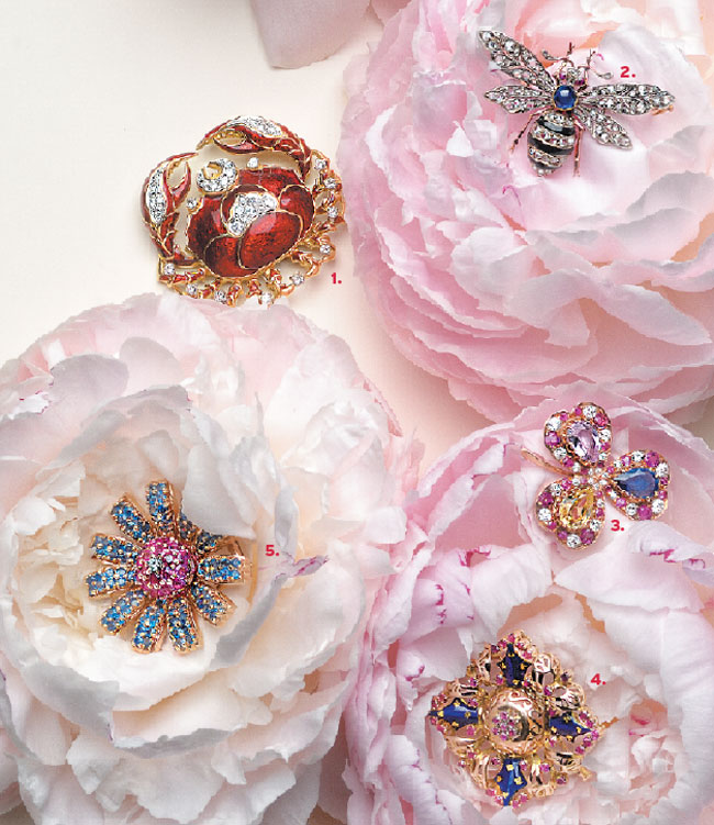 2. Bumblebee brooch made in France, circa 1880, in 18K rose gold with sapphires and diamonds. $15,750, Steven Fox Jewelry, 8 Lewis St., Greenwich, 203-629-3303, stevenfoxjewelry.com. 3. Clover brooch with fancy-color, pear-shaped sapphires in a ruby and diamond frame, circa 1870. $25,000, Betteridge, 117 Greenwich Ave., Greenwich, 203-869-0124, betteridge.com. 4. Card suits pin in blue enamel with rubies set in 18K rose gold, circa 1940s. $1,890, Nagi Jewelers, 828 High Ridge Rd., Stamford, 203-964-0551, nagis.net. 5. Ostier brooch with sapphires and rubies, circa 1950, set in 18K gold. $7,800, Hollis Reh & Shariff, 2 Jobs Ln., Southampton, NY, 631-283-6653, hollisrehandshariff.com.