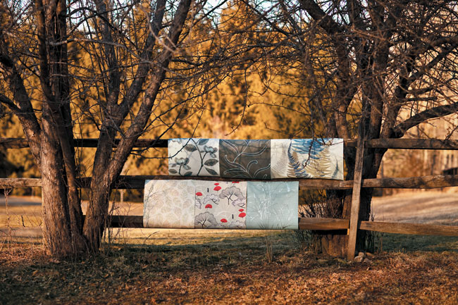 TAKE FLIGHT (right, from left) Cole & Son’s Dovedale in Duckegg, from A Collection of Flowers. Clarke & Clarke’s Indara in Damson, from the Showstoppers collection. Thibaut’s Ecuador in Lilac. Manuel Canovas’ Sark, #0305213B. Galbraith & Paul’s Birds in Cadet. On ladder: Studio Four’s Dandelion Creatures in Greener Pastures by Flat Vernacular. Lillian August Rustic birdcage, #HY5292, Norwalk, 203-847-1596, lillianaugust.com.