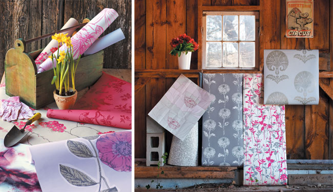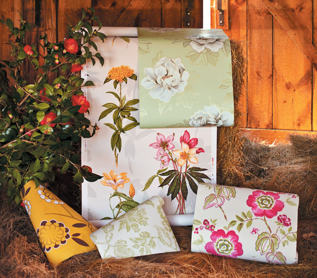SECRET GARDEN WAllpaper (left, clockwise from top left) In toolbox: Harlequin’s Giselle in Silver and Red, #110135, from the Delphine collection. Clarke & Clarke’s Hula in Fuchsia, #W0025/01, from the Showstoppers collection. On table: Motif Design’s Oiseaux de Paradise Red by Pierre Deux French Country. Stark’s Poppy in Viola by Jocelyn Warner, #JWP-1004. Trove’s Hundun in 003.