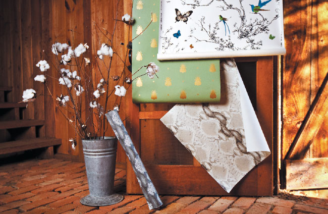 ROUGH IT Wallpaper (above on right) Thibaut’s Martinique in Tobacco, #839-T-7026, from the Natural Resource collection. Gardenhouse’s Summer Daisies in Lavender, from the GardenWalls line. Studio E’s Tara in Onyx, #1640, from the Venetian Plaster collection. Philip Jeffries’ Bamboo Forest, #4101. GardenWalls wall coverings available through Gardenhouse, West Palm Beach, FL, 561-832-8260, gardenhousedecor.net.