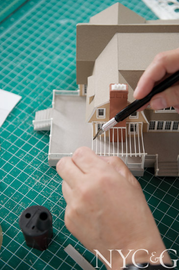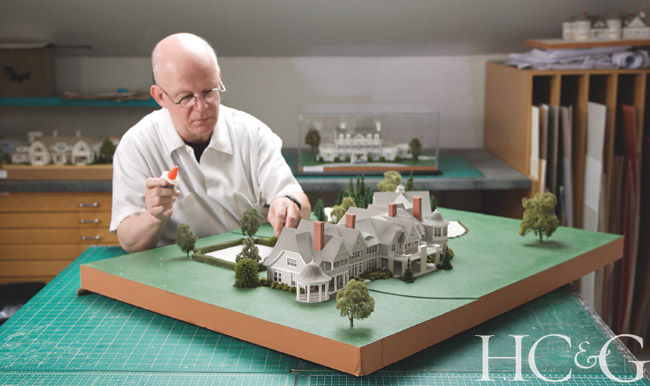 To hand-craft his intricate 1⁄8-scale miniature models of houses and other structures, he uses an arsenal of model-making tools: foam core, mat board, double-sided tape, Elmer’s Glue-All, and X-Acto knives. Working from floor, elevation, and roof plans, he begins by creating a basic white structure. For more elaborate representations, he’ll work in color and even actual building materials, replicating interiors, landscaping, pools, accessory buildings, and smaller details, such as tiny luxury cars in the driveway and trees lining a walkway.