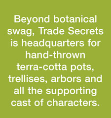 Beyond botanical swag, Trade Secrets is headquarters for hand-thrown terra-cotta pots, trellises, arbors and all the supporting cast of characters. Then on May 19, the day after the sale, go on the Trade Secrets Garden Tour and see how Bunny Williams does it on her home turf. Lee Link, Mudge Manor and Plum Creek are also opening their garden gates.