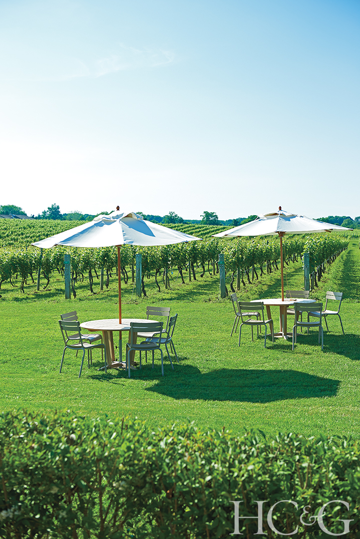 A lounge-like atmosphere pervades the redecorated wine stand, thanks to outdoor furnishings from Thayer’s Hardware & Patio—including Fermob’s Luxembourg chairs, Kingsley Bate’s teak tables and faux woven-wicker Spencer settees and club chairs, and umbrellas by Woodline Shade Solutions.