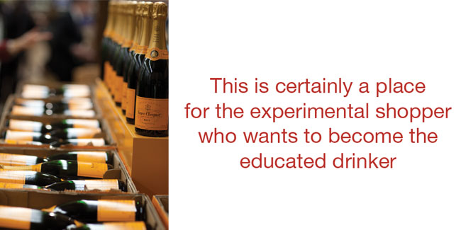 My advisor was most informative about the selection of small-batch beers. Shelves of individual craft brews from around the world were organized by different styles—pale ale, lager, porter, stout, specialty hybrid. In the Belgian section, I eyed a 3-liter bottle of Corsendonk Abbey Brown, which seemed the right choice for a Belgian baroness. “Make your own six-pack” boxes are the perfect opportunity to sample little-known labels, such as Clown Shoes, an American wheat beer, and Blue Point, a Vienna lager.