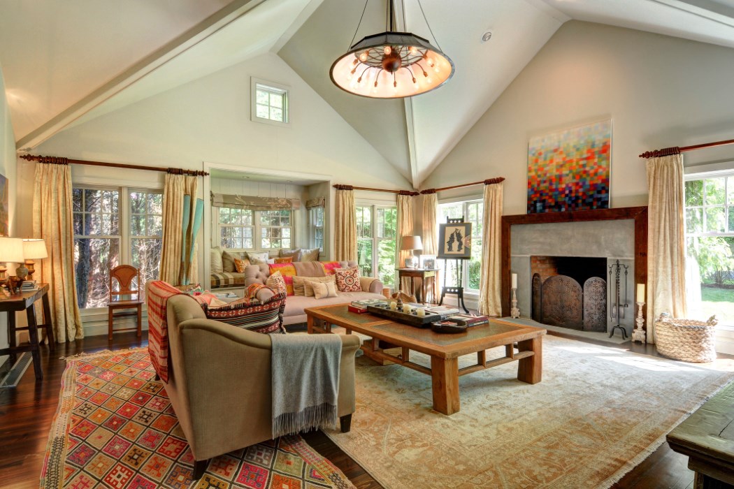 The living room features a dramatic vaulted ceiling and plenty of natural light.