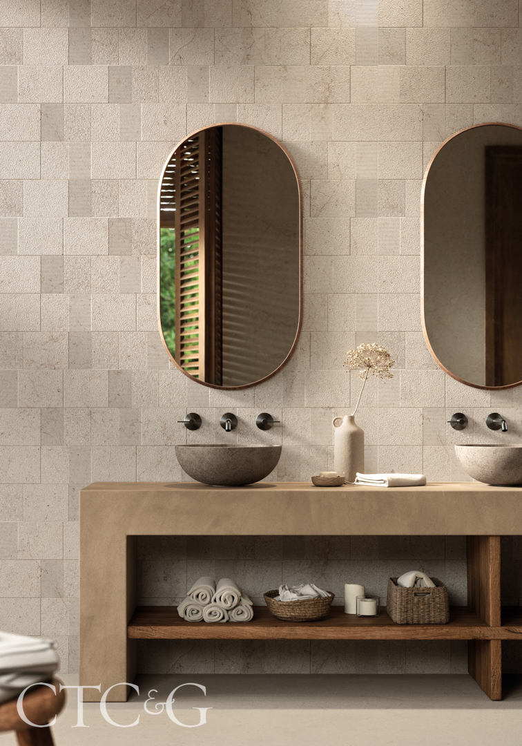 Informed by the timeless beauty of limestone, the Dorcia collection from PORCELANOSA combines a soft, matte finish with the natural appearance of porous stone. Block design (shown) mimics a combination of variously sized rectangular pieces with bush-hammered and slotted finishes.