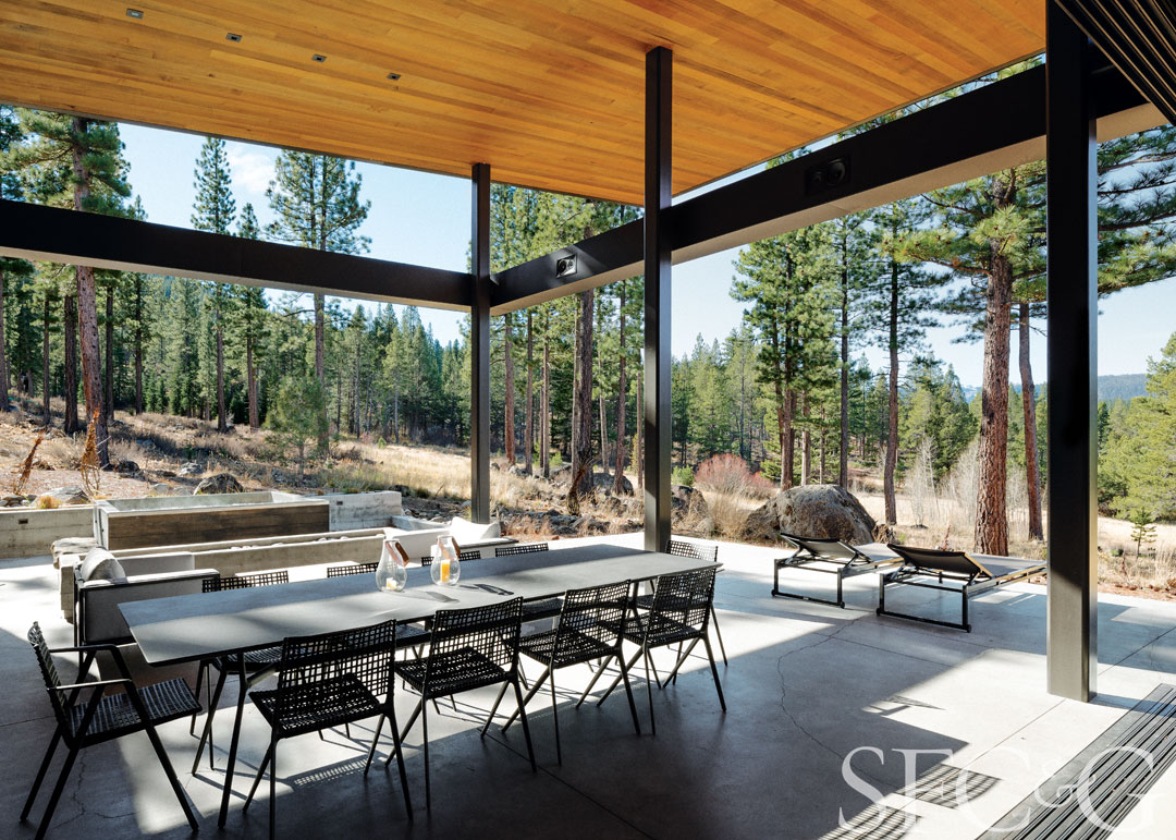 Contemporary lines frame the view of this outdoor patio, creating an ideal spot for communing with nature. San Francisco’s John Maniscalco Architecture designed the mountainside escape.