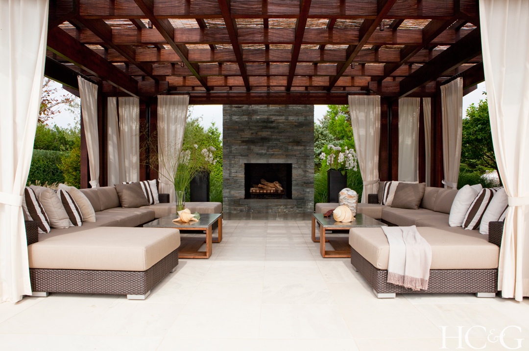 Set in the Hamptons, this covered pavilion serves as a dedicated space for socializing. The “thatched” roof provides the illusion of a ceiling and interior details like fabric curtains, upholstered furniture and a fireplace lend an indoor vibe.