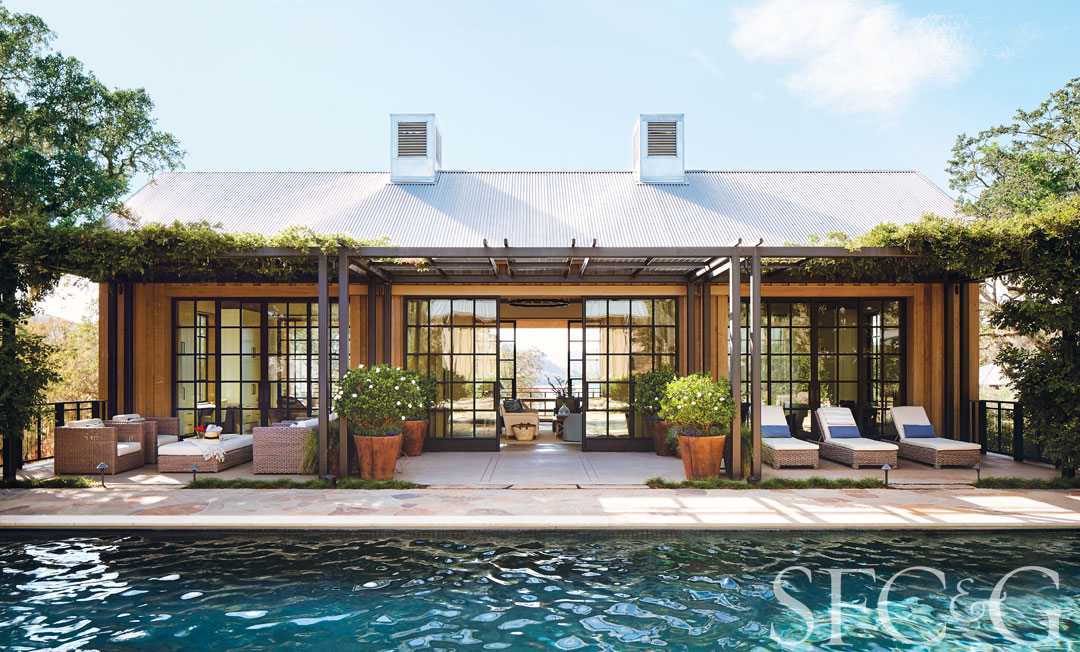 Retractable steel-and-glass doors allow for indoor-outdoor living in this St. Helena guest house. The vine-covered pergola is in keeping with the architecture of the modern structure, designed by Backen, Gillam & Kroeger Architects and provides a shady spot for reading and relaxing.