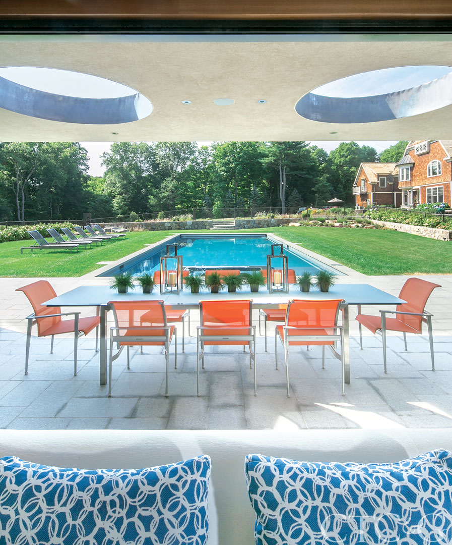 Seeking a departure from their traditional residence, these Connecticut homeowners asked architect Jonathan Wagner for a vacation getaway on property. He delivered with a modernistic pool house. The sculptural design of the stucco overhang provides shelter, while five five-foot diameter holes cast light and shadows for dramatic effect.