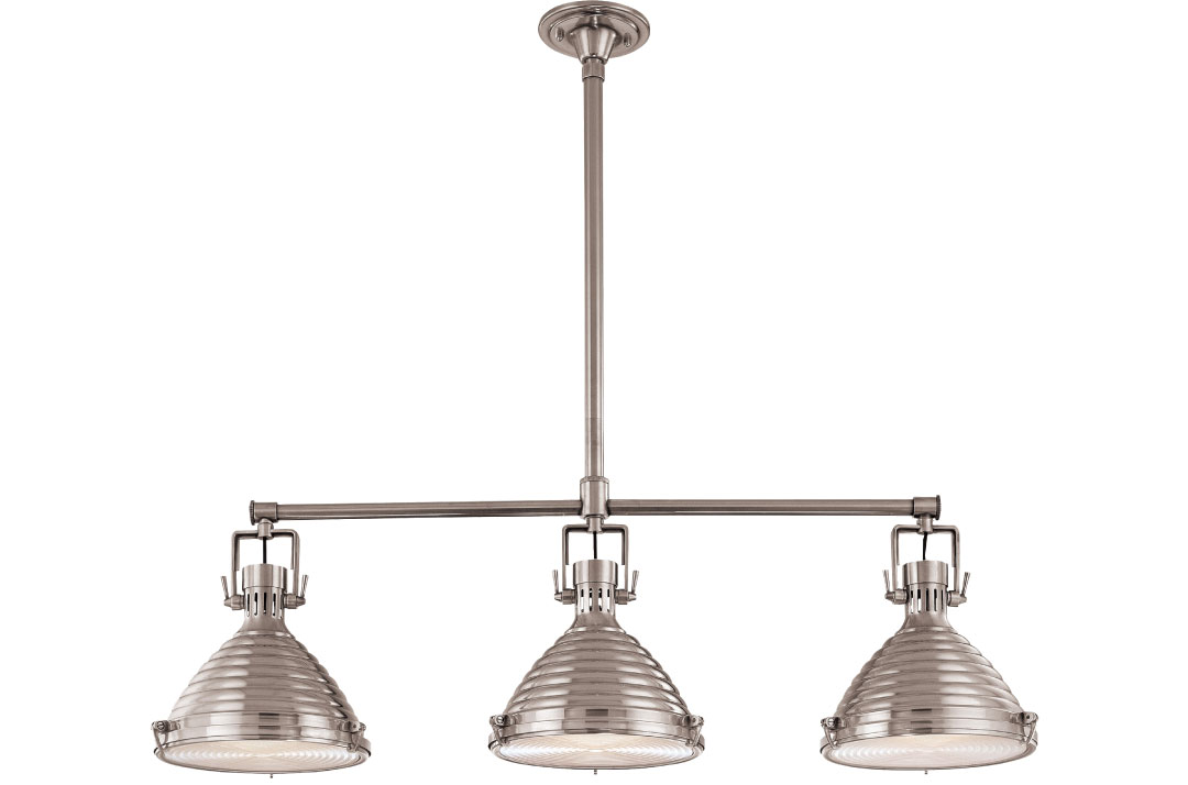 Vintage marine details and vertical ribbed glass set off the Haverhill over-island lighting from Hudson Valley Lighting. Available finishes: old bronze, polished and satin nickel. Hudsonvalleylighting.com, through Klaffs, klaffs.com.