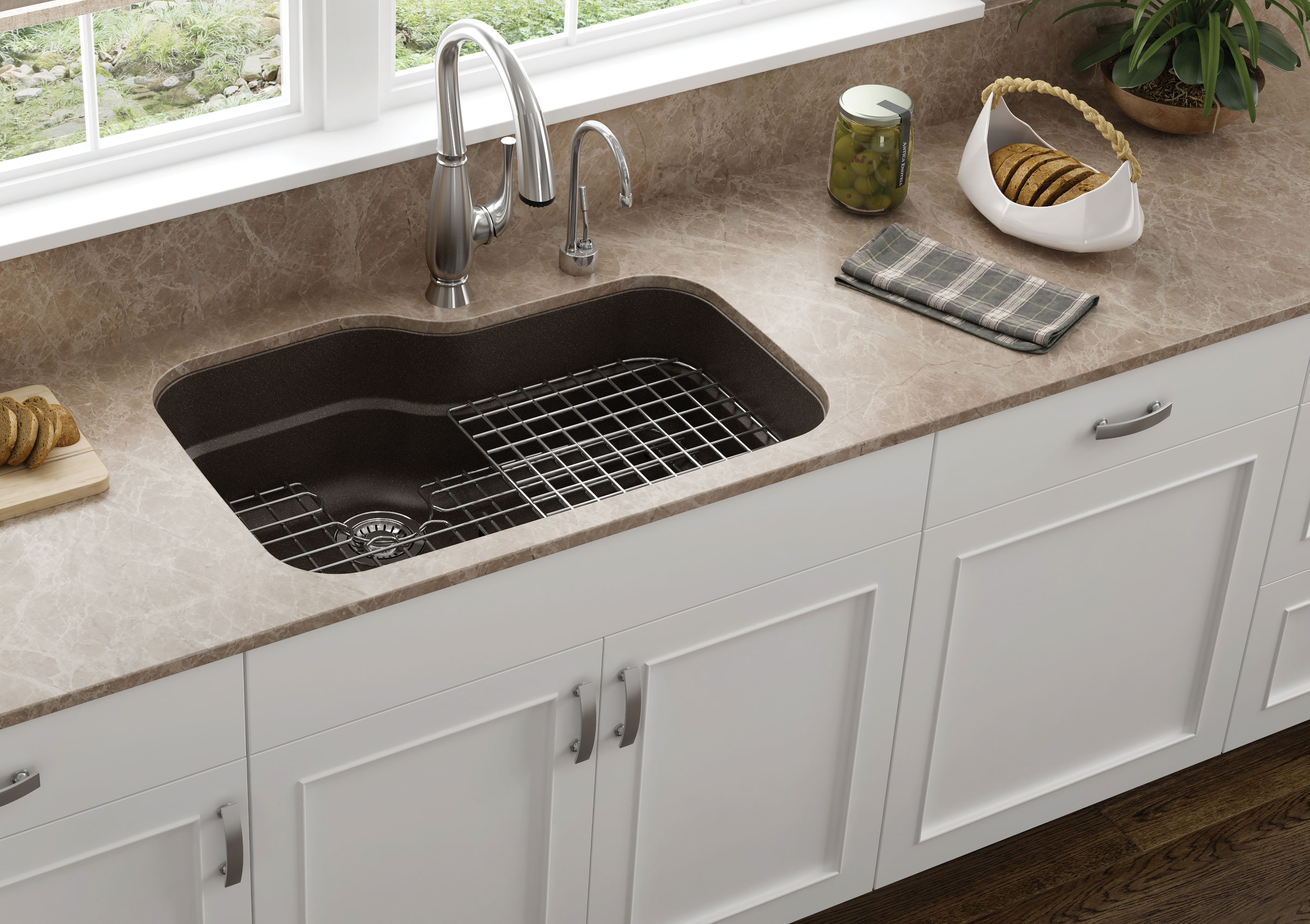 The integrated ledge system and unique shape of the Orca sink from Franke makes food prep and clean up easy. Accessory options include a drying rack, colander and cutting board. The granite finish (available in six colorways) is heat resistant with antimicrobial protection. Frankeksd.com, through Deane Inc., deaneinc.com.