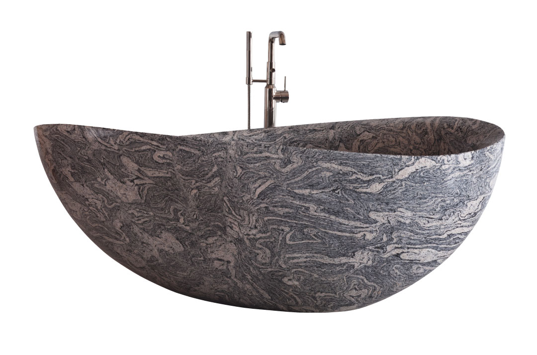 Carved from a single block of granite (shown), marble or onyx, the Papillon bathtub from Stone Forest is a made to order statement tub. Through Klaffs, Norwalk.