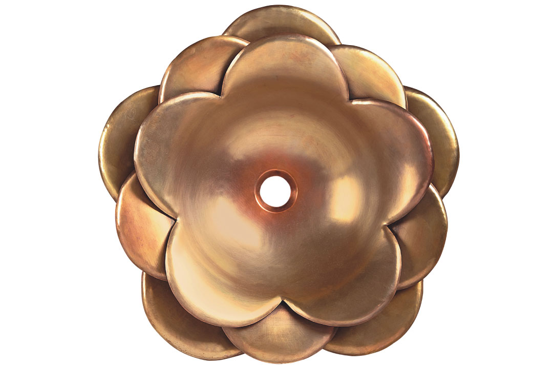 The Fiore sink’s layered, handcrafted copper petals bring the beauty of a blooming garden into the bath. Thompson Traders, through Frank Webb’s Bath Center, Stamford.