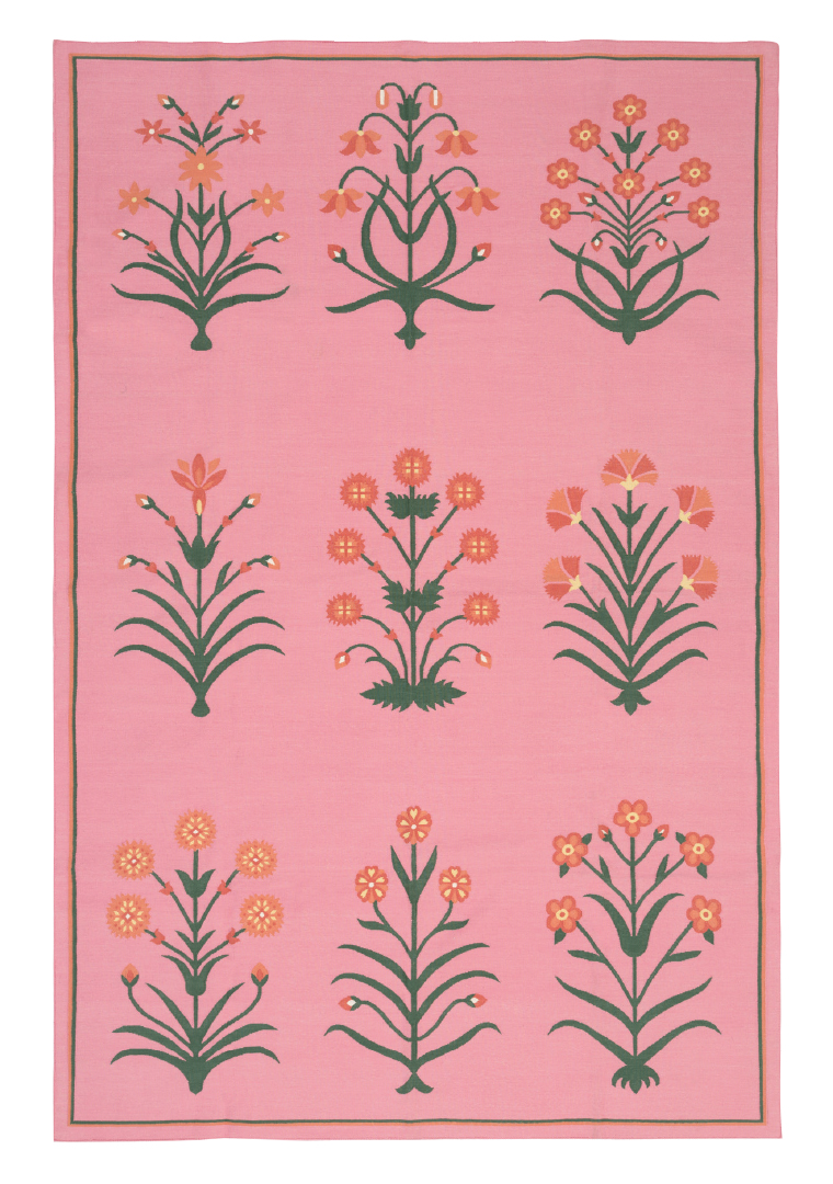 Inspired by Mughal motifs and the artwork of Sandro Botticelli, Madeline Weinrib’s handwoven cotton Camilla rug is available in various sizes and eight colorways. $3,000 (for 6′ x 9′, shown), at Lazypoint, 171 Main St., Amagansett, 631-604-1268.
