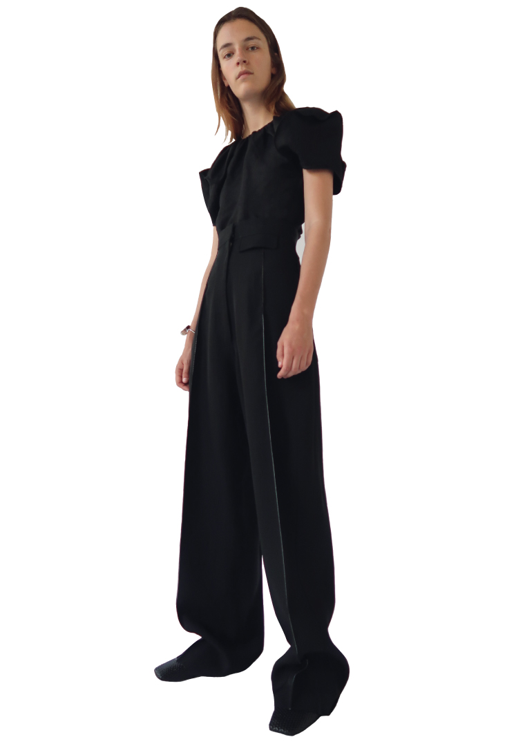 A study in proportion, Céline’s chic black look from the spring 2017 collection has a strong silhouette. Top, $1,450, Trousers, $1,650, Moccasins, $910, céline.com.