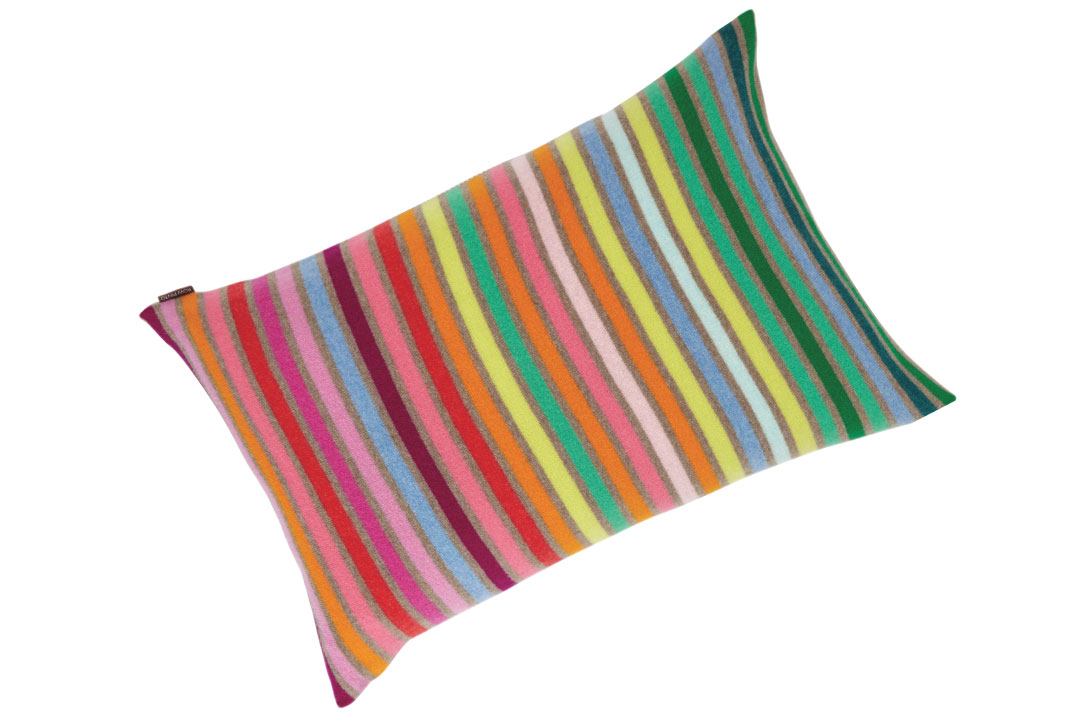The candy-colored bands of Praise I recall the pinstripe rainbow on this Scottish lamb’s-wool throw pillow from Clic General Store. $250, 255 Centre St., NYC, 212-966-2766.