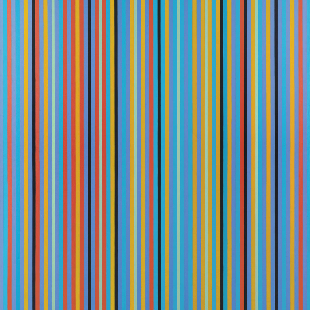 Although she is best known for her geometric black-and-white Op art paintings, Bridget Riley also gained fame with her “Stripe” series, including the 1981–82 work Praise I.