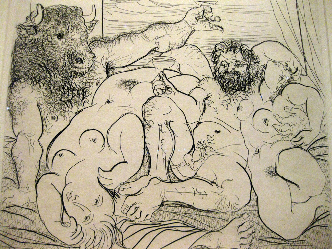 Even after entering his Cubist phase, Pablo Picasso continued to experiment with classical motifs, as seen in the 1933 print Bacchanal and Minotaur.