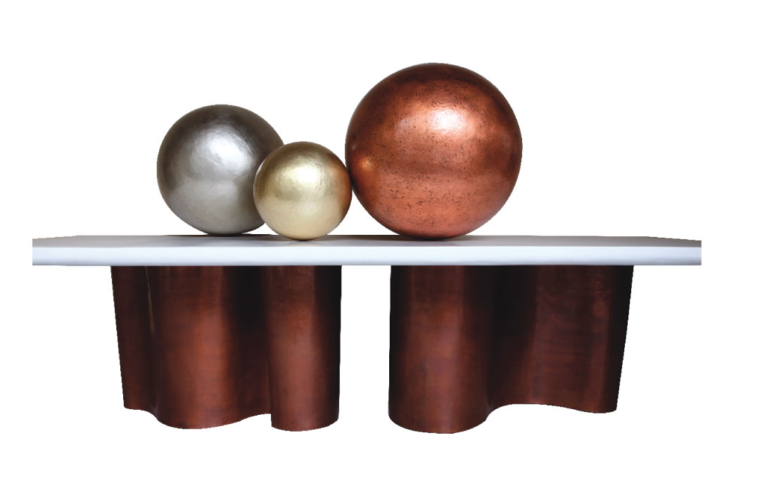 The serpentine shape of Robert Kuo’s Root dining table, which features a hand-hammered antiqued copper base and a cream lacquer top, is not unlike the undulating form of Richard Serra’s 2005 towering steel sculpture The Matter of Time, on view at the Guggenheim Museum Bilbao. $30,000, 303 Spring St., NYC, 212-229-2020.