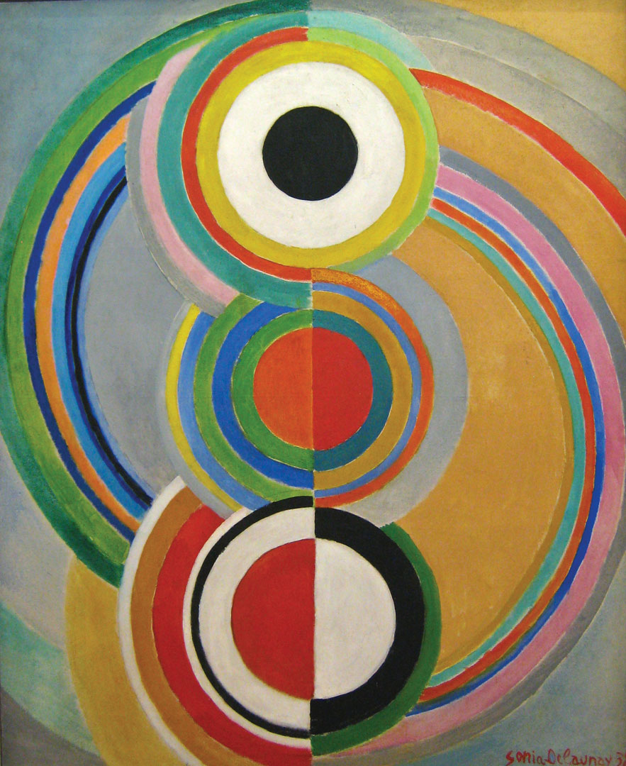 The multitalented Sonia Delaunay dabbled in fashion, textile, and costume and set design, but was first and foremost a painter whose work is characterized by geometric forms and bright hues, such as the pulsing concentric circles found in her 1938 Rythme.