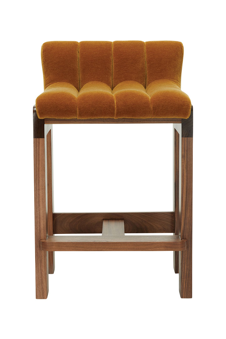 Designed by Levi Christiansen for Lawson-Fenning, the El Cap bar stool is constructed with a hardwood walnut frame and upholstered in a channel-tufted Butterscotch mohair. $3,625.