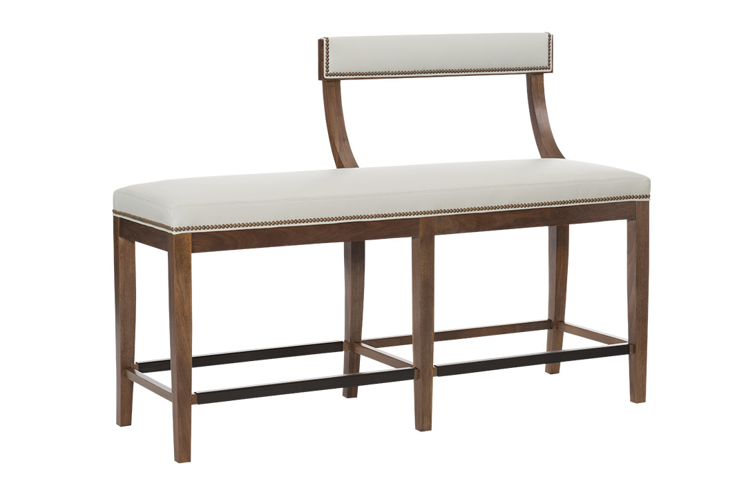 The asymmetrical Split Klismos Bench from Hickory Chair’s Ray Booth upholstery collection accommodates