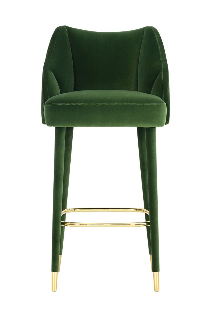 Designed and made in Portugal, the Figueroa bar stool is fully upholstered, from seat to legs, in a green velvet, accented with polished brass leg caps and footrest. Available through the trade, price upon request.