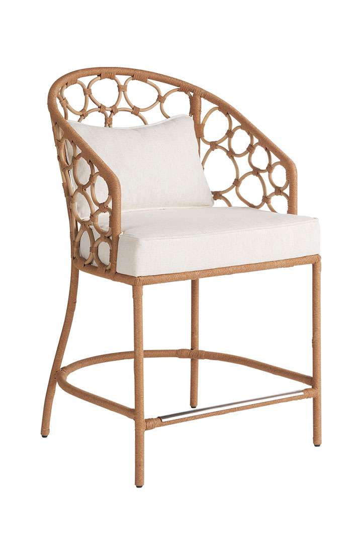 The rattan circles of the Pebble counter chair mimic the pattern of a pebble-strewn beach. An upholstered seat and kidney pillow add comfort and style. Available in natural rattan or a sea salt finish. $1,265.