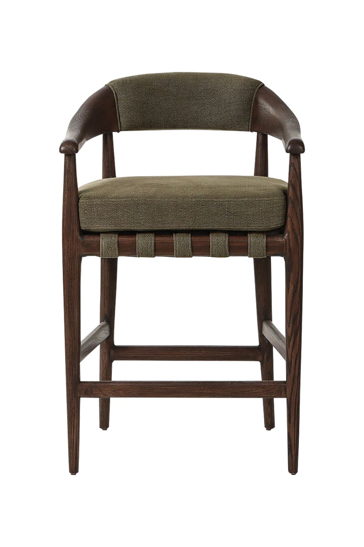 The Dane counter stool features a webbed seating structure for support. The upholstered back and strap details are softened with a loose cushion in an olive flax/linen blend. $999, available through Perigold.