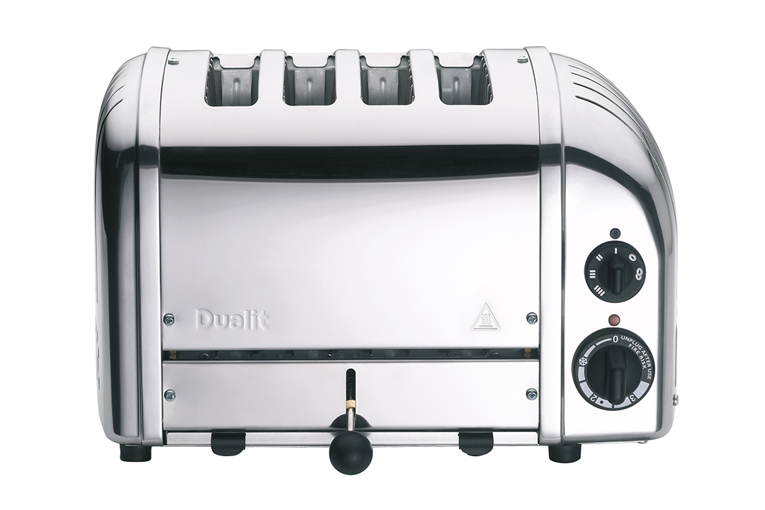 Hand built in the UK by skilled craftsmen, each Dualit Classic NewGen toaster features the assembler’s name on the base. Four extra-large slots accommodate buns or bagels, and the toaster is offered in a selection of finishes including white, metallic charcoal, eucalyptus, red, copper and polished, shown here.