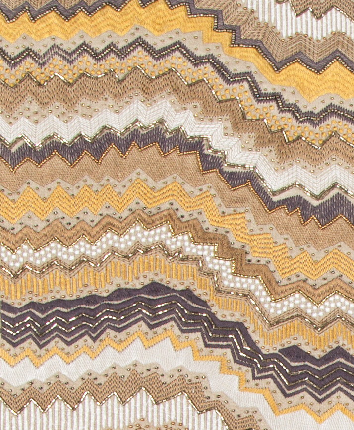 The L’Atelier Moderne textile collection draws its inspiration from fashion; the graphic Otes ZigZag is hand-woven and ornamented with decorative stitching and beading (shown in Beige/Gold). $498/per yard, brunschwig.com.