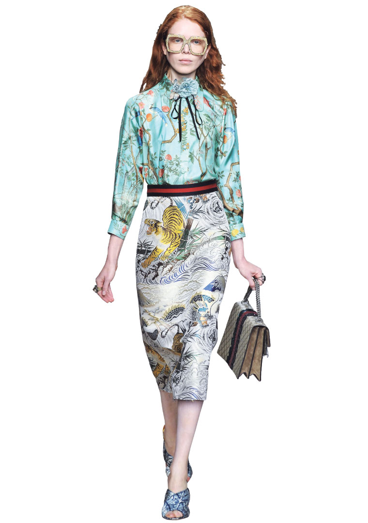 Romanticism is reborn in Gucci’s spring/summer 2016 collection. The Tiger Jacquard silk skirt features lyrical botanical and animal motifs. Skirt $1,690.
