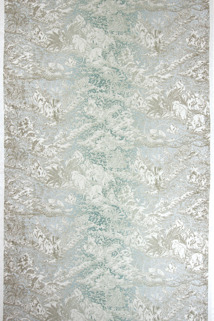 The exquisite new Chaparal toile from Jim Thompson features intricate illustrations taken from an antique gold leaf and lacquer cabinet. Its ethereal colors fade across the fabric, creating an ombré effect. Available in Celadon (pictured) and two other colorways. Price upon request, through Shears & Window.