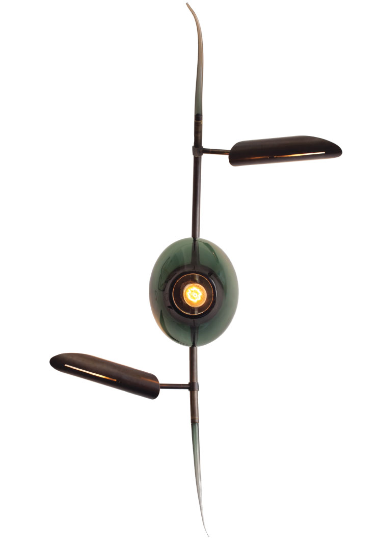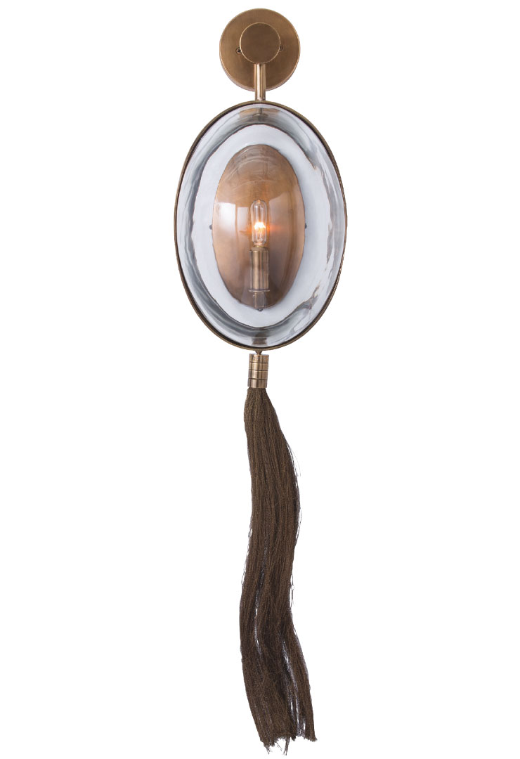 Drawing inspiration from Alexander McQueen and Philip Treacy’s bodysuit/headdress, the Aramis sconce, by Barry Dixon for Arteriors, is cast in brass with a convex-glass shield and brass wire “ponytail.” Through Trovare Home, Cos Cob, 203-869-5512, trovarehomedesign.com, arteriorshome.com.