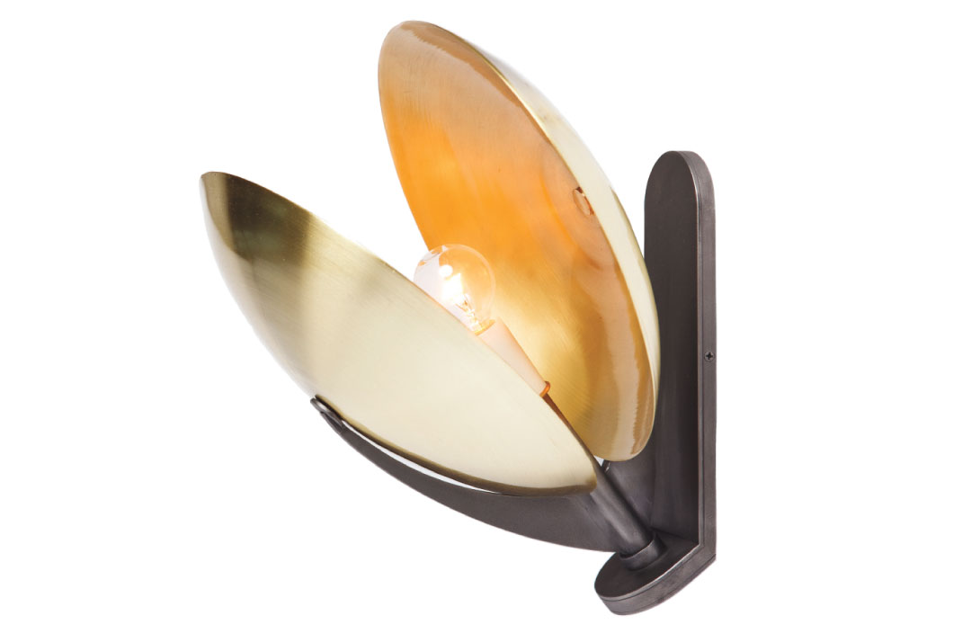 The Kino wall sconce, designed by Justin Giunta for Avrett, is reminiscent of under-the-sea crustaceans and the rising run. Shown here in brushed steel and satin brass, the fixture is available in an array of custom finishes. Through John Rosselli & Associates, D&D, 212-593-2060, johnrosselli.com, avrett.com.