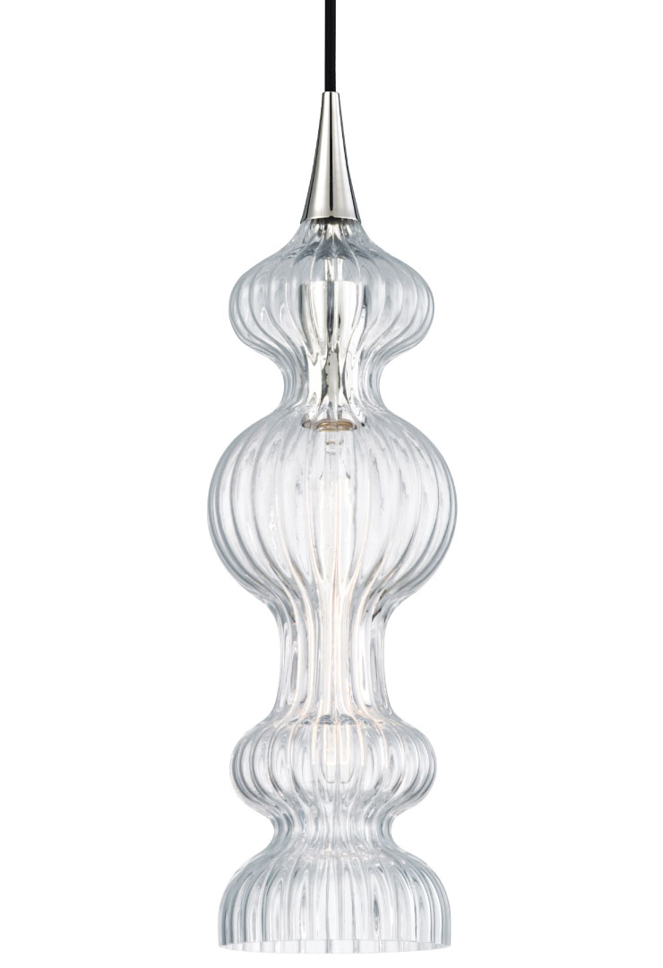 Thick spindle-blown glass surrounds a tube-shaped, exposed-filament bulb in the Pomfet ceiling fixture from Hudson Valley Lighting. The sinuous glass piece is available in blushy pink, light blue, amber, bronze and clear (shown here). Through Klaffs, Norwalk, 203-866-1603, klaffs.com, hudsonvalleylighting.com.