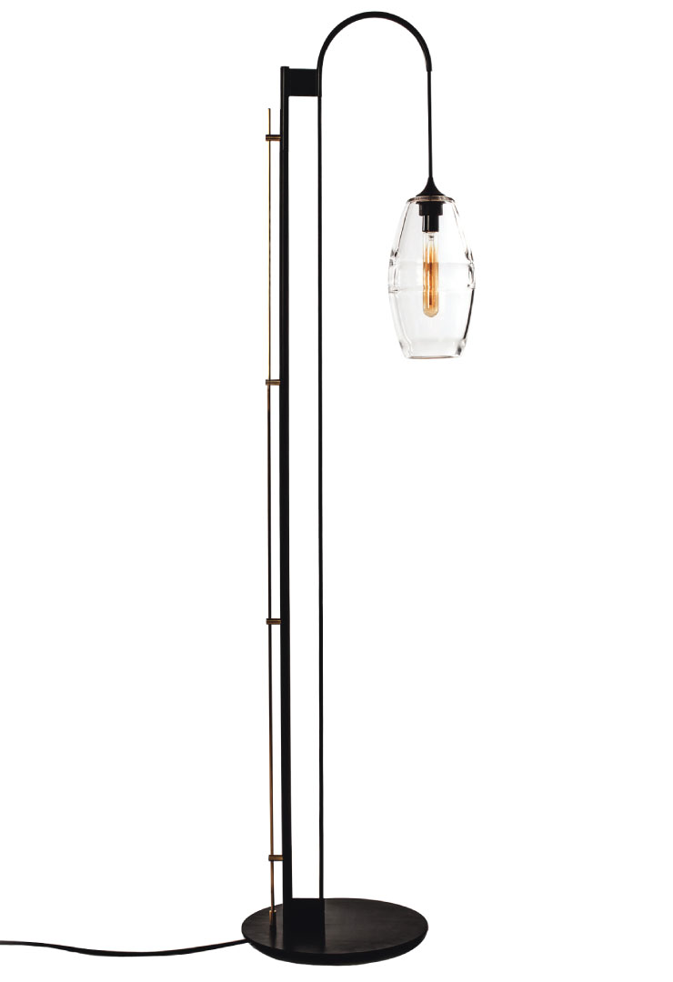 Standing on an oil-rubbed, blackened steel base that will naturally patina over time, the hand-blown glass pendant on the Clear Band floor lamp from John Pomp suspends off an elegant black woven cord. Through A. Rudin, D&D, 212-644-3766, arudin.com, johnpomp.com.
