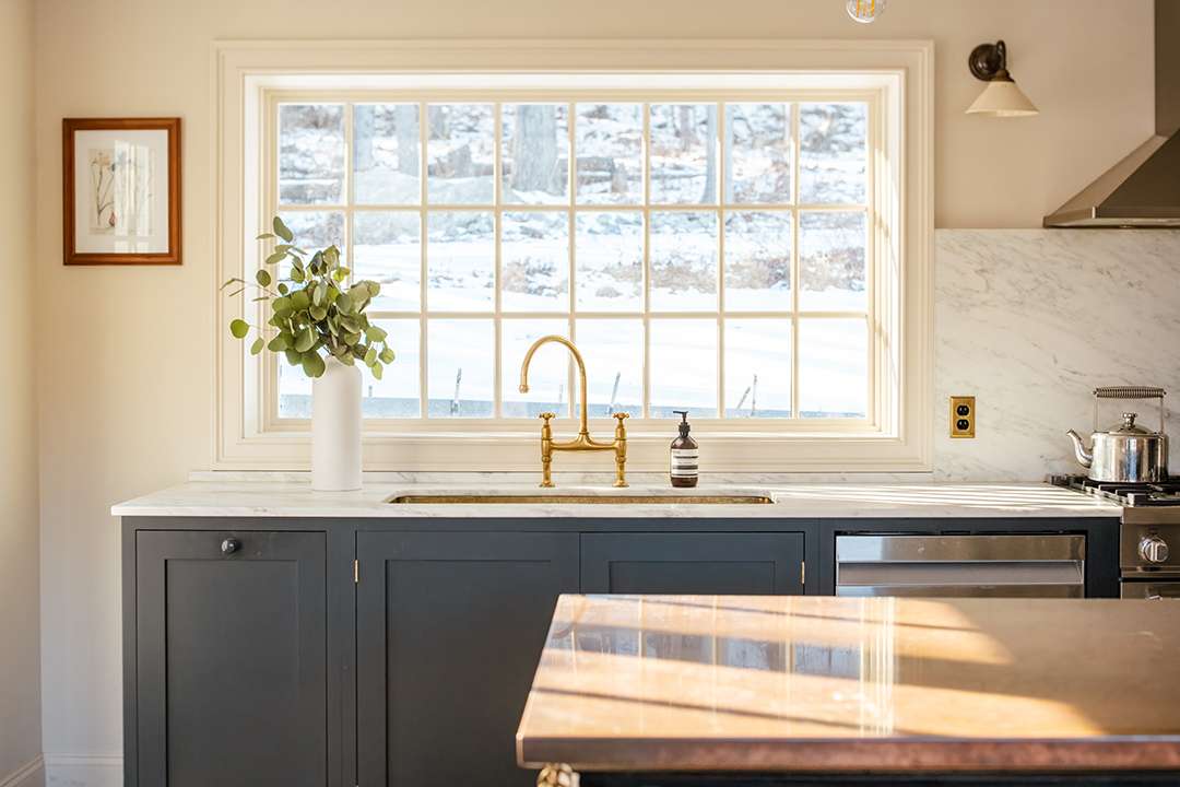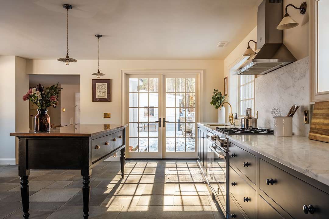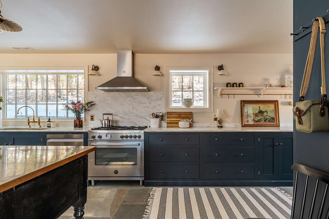 Inside, restorations have preserved its original oak floors, detailed moldings, and brass hardware. At the heart of the homestead is a DeVol kitchen. Deep navy cabinetry contrasts against light walls and a marble backsplash, while handcrafted brass accents, porcelain lighting, and English millwork add vintage character. A Bertazzoni gas range, antique copper island, and extra prep sink make it fit for cooking and entertaining or what would have been a pioneer’s feast.