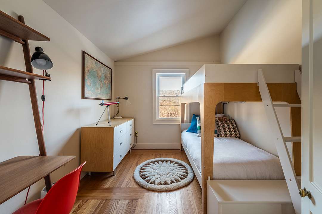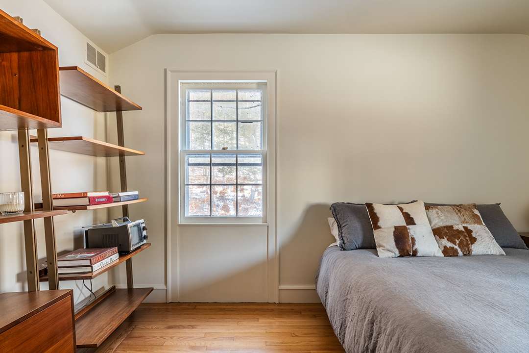 Cozy yet bright, the home’s layout unfolds effortlessly. The dining room leads into the kitchen and breakfast nook, then opens up to the living room. Almost immediately your eyes are drawn to the built-in bookshelves and wood-burning fireplace. A full bath and separate mudroom complete this level. Upstairs, three additional bedrooms and a primary suite unfold beneath the eaves each with peaceful views of the woods.