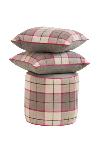 Custom 16” x 16” x 17” drum-style foot ottoman, gray, charcoal, pink, wool textured body, gray tweed-wool top, leather pink welt detail. Pair of matching pillows with feather inserts. 631.842.6226